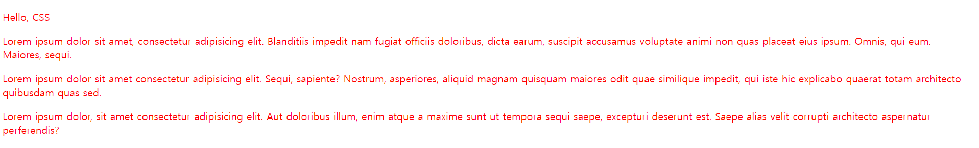 만약 위 예제 코드에서 <p> 태그의 모든 내용을 빨간색으로 바꾸려면 어떻게 해야할까?