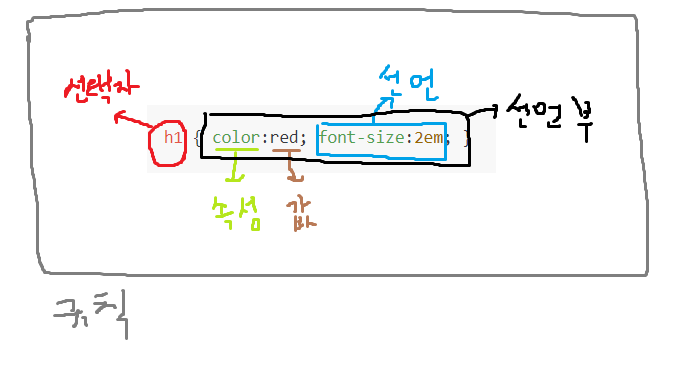 CSS는 선택자(selector), 속성(property), 값(value), 선언(declaration), 선언부(declaration block), 규칙(rule set)으로 이루어져 있다.