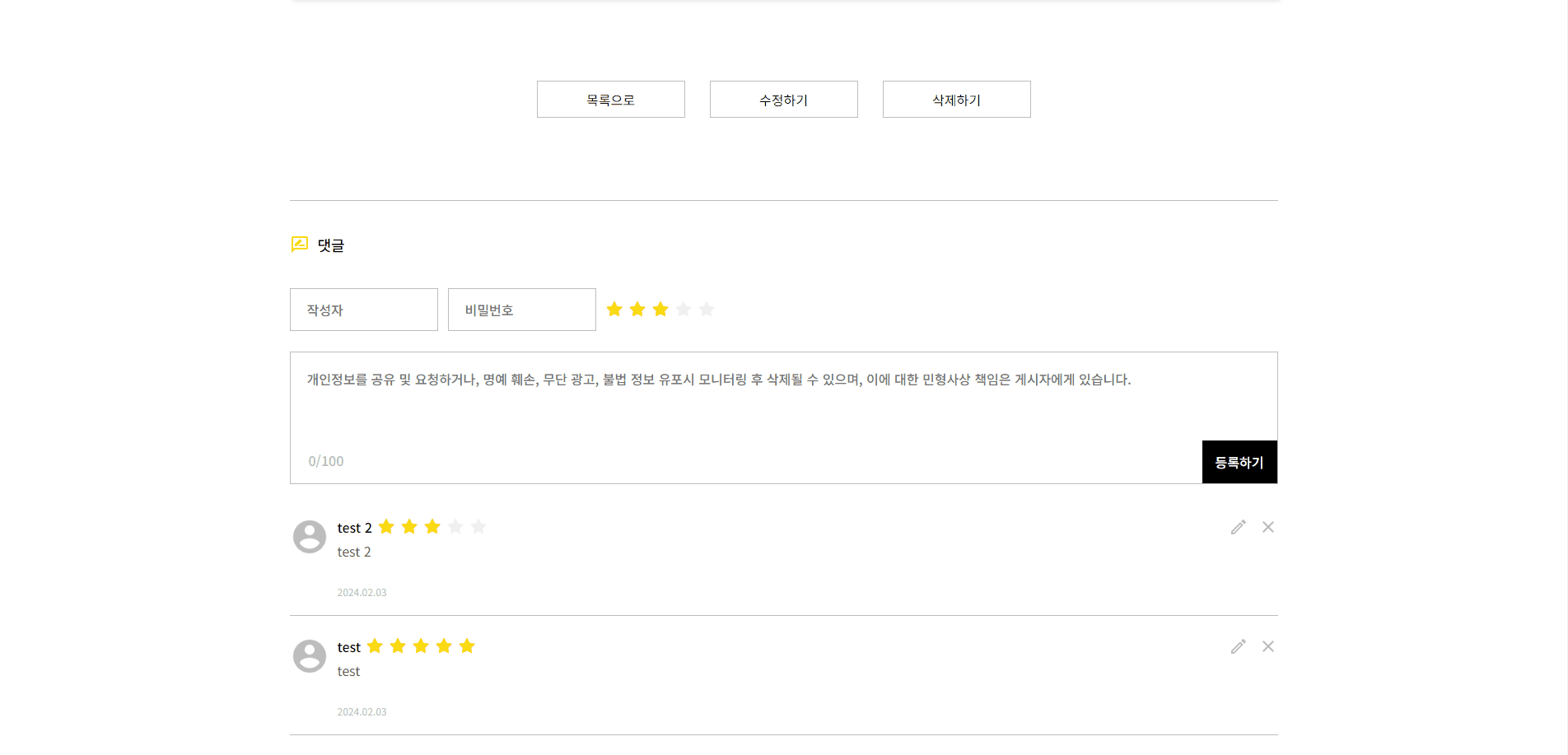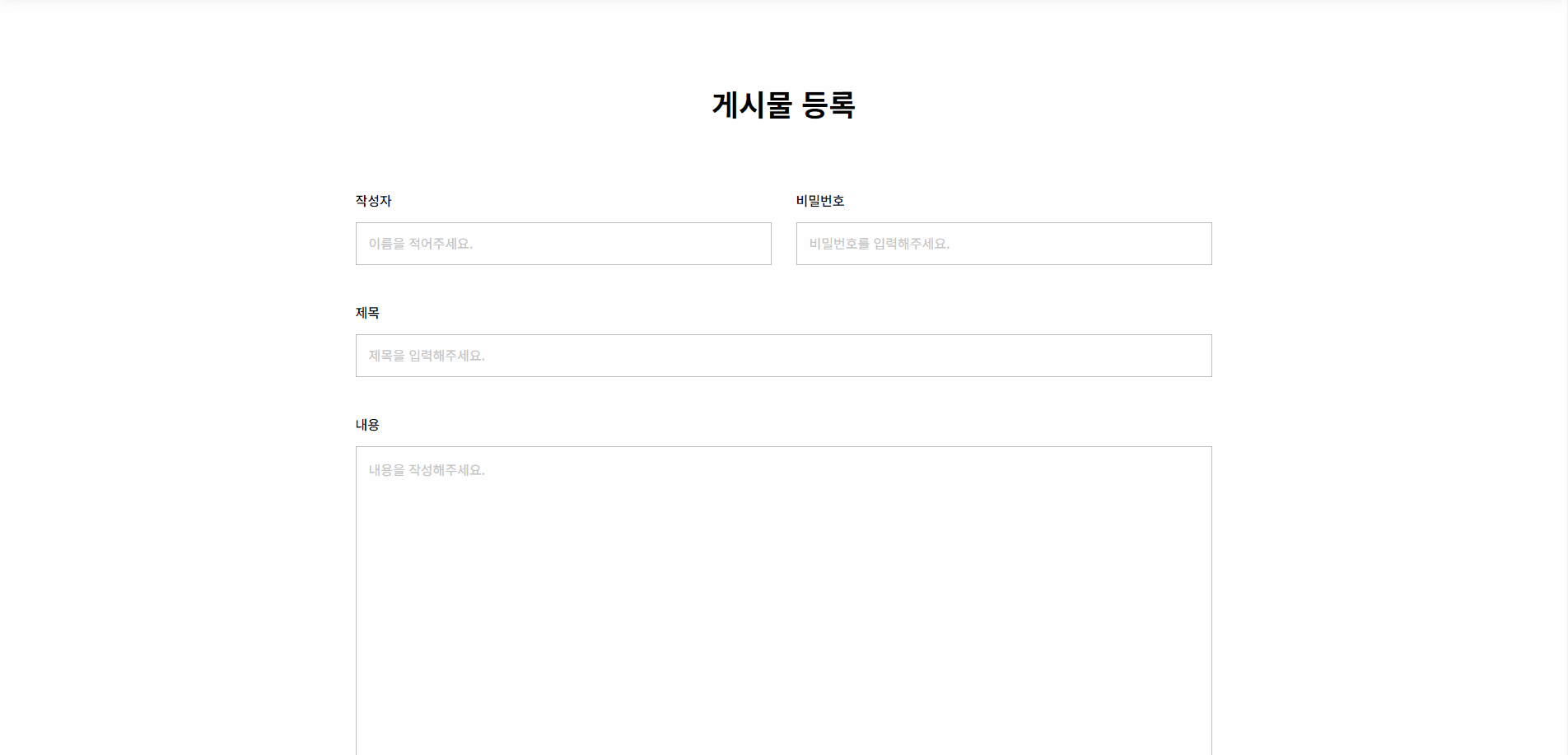 - 작성자, 비밀번호, 게시글 내용을 입력하지 않으면 등록하기 버튼이 활성화되지 않습니다.