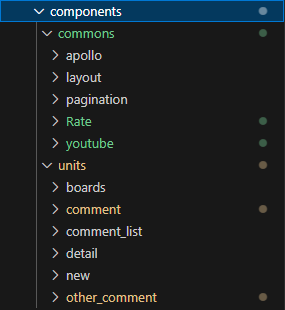 components 폴더 내부는 재사용이 가능한 commons 컴포넌트와 단일 컴포넌트들을 모아놓은 units 폴더가 위치합니다.