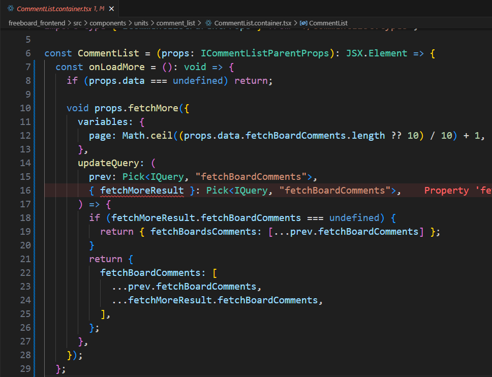 fetchMoreResult의 타입 에러가 발생하는데, 아직 해결하지 못했습니다.