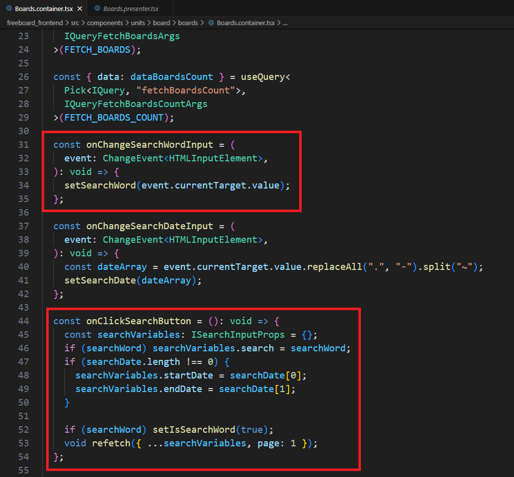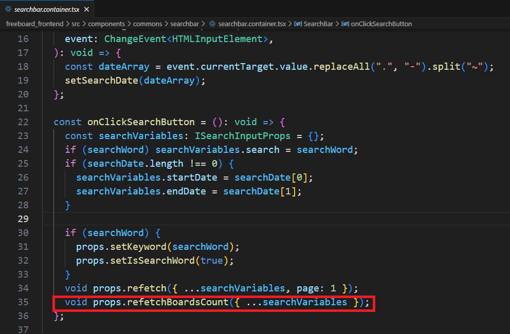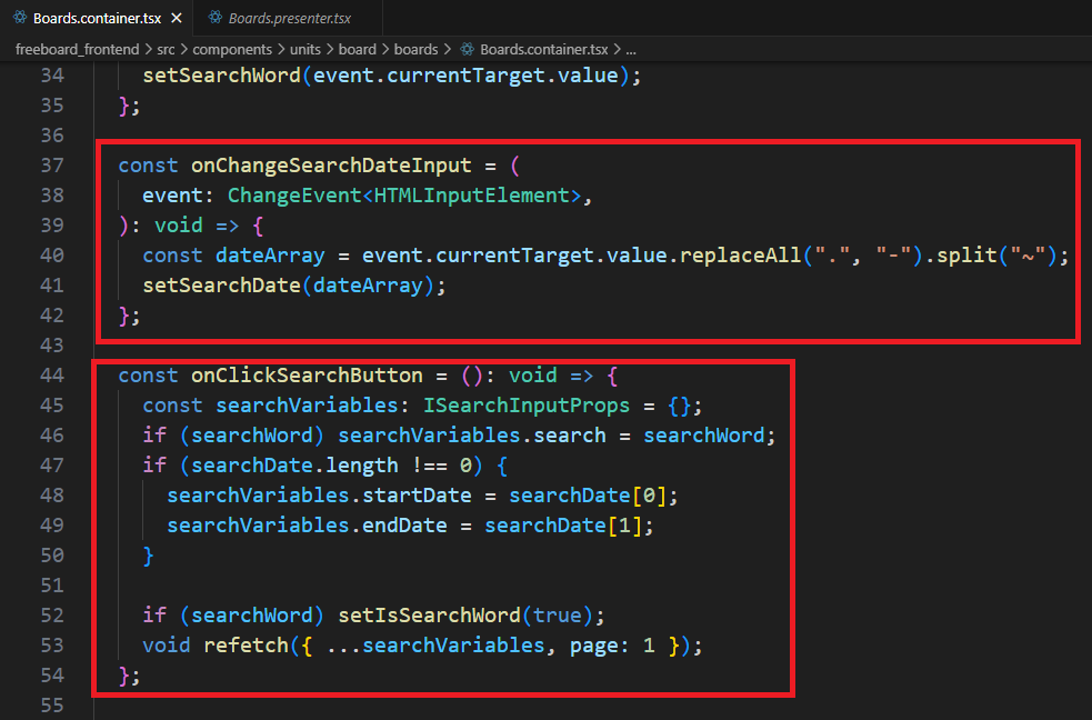 onClickSearchButton 함수가 실행되면 입력된 날짜들 사이에 등록된 게시물들을 fetch해옵니다.