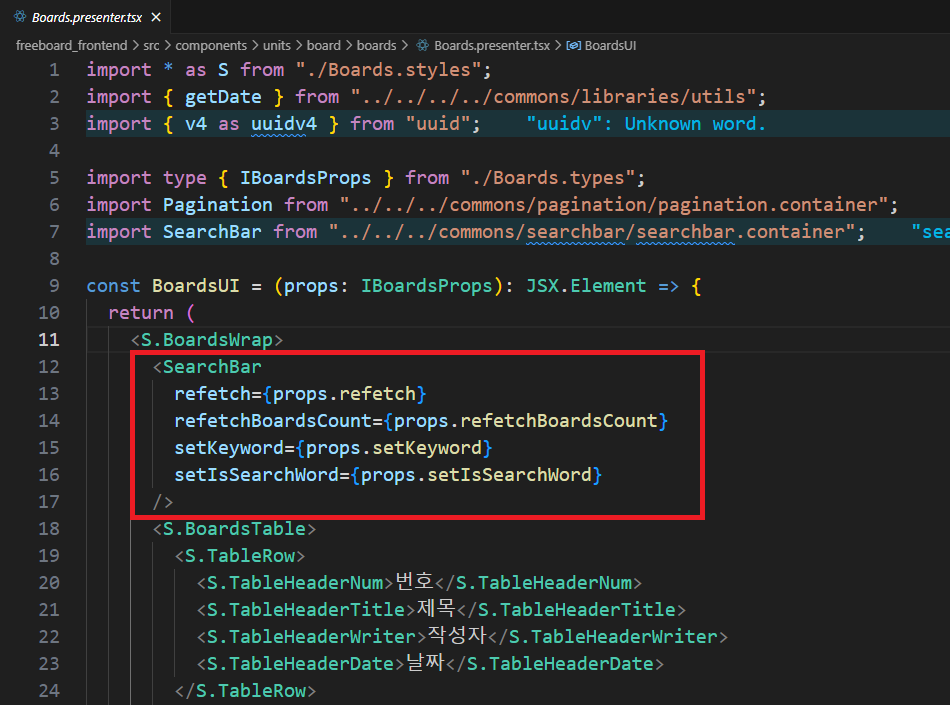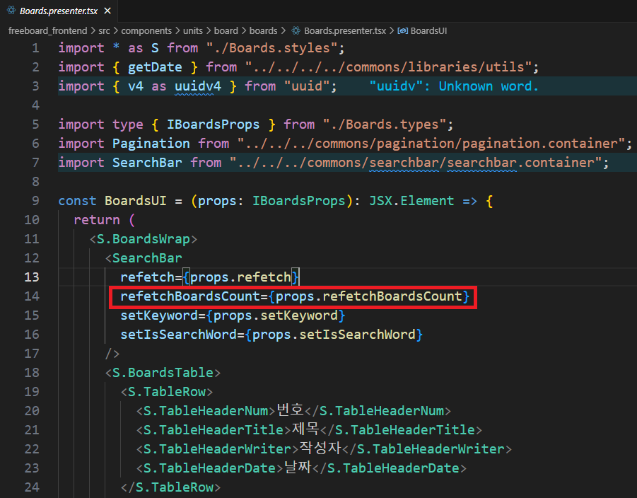 refetch는 props를 통해 검색창 컴포넌트로 전달됩니다.