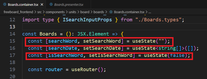 키워드 검색 기능 추가를 위해 searchWord state와 isSearchWord state를 추가했습니다.