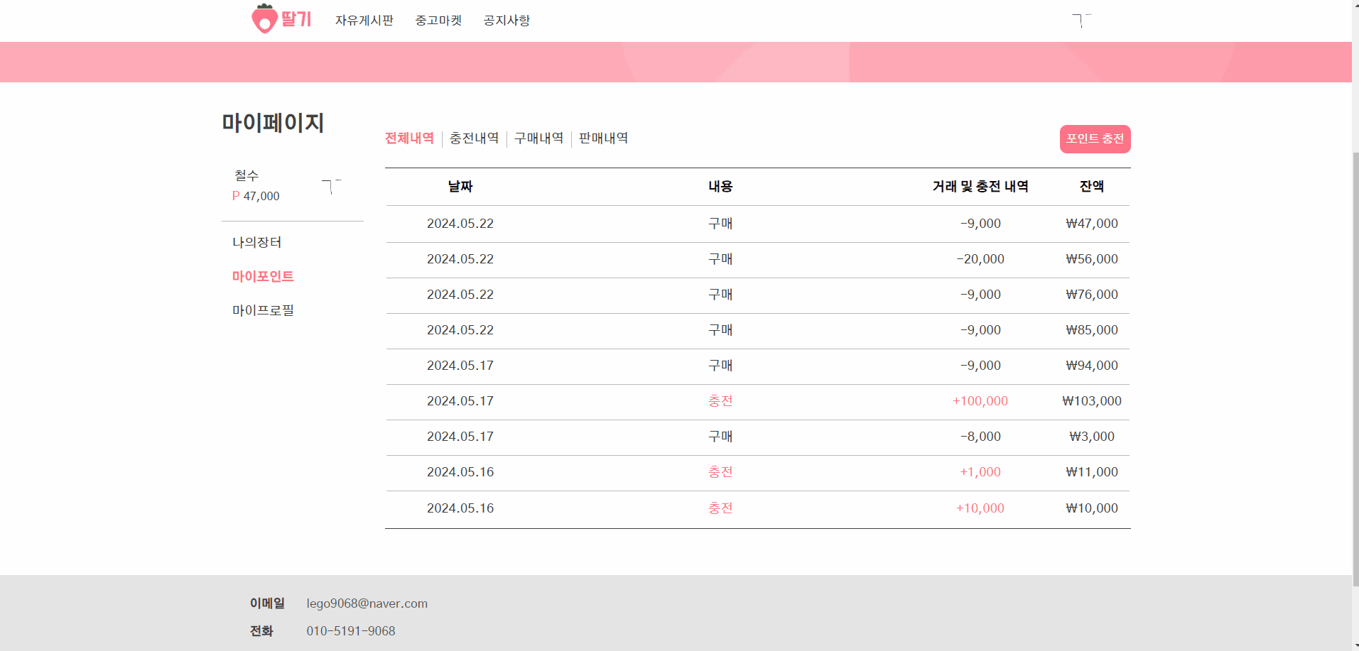 - 포인트가 증가하는 내역(충전, 판매)은 전체내역에서 분홍색으로 표시됩니다.