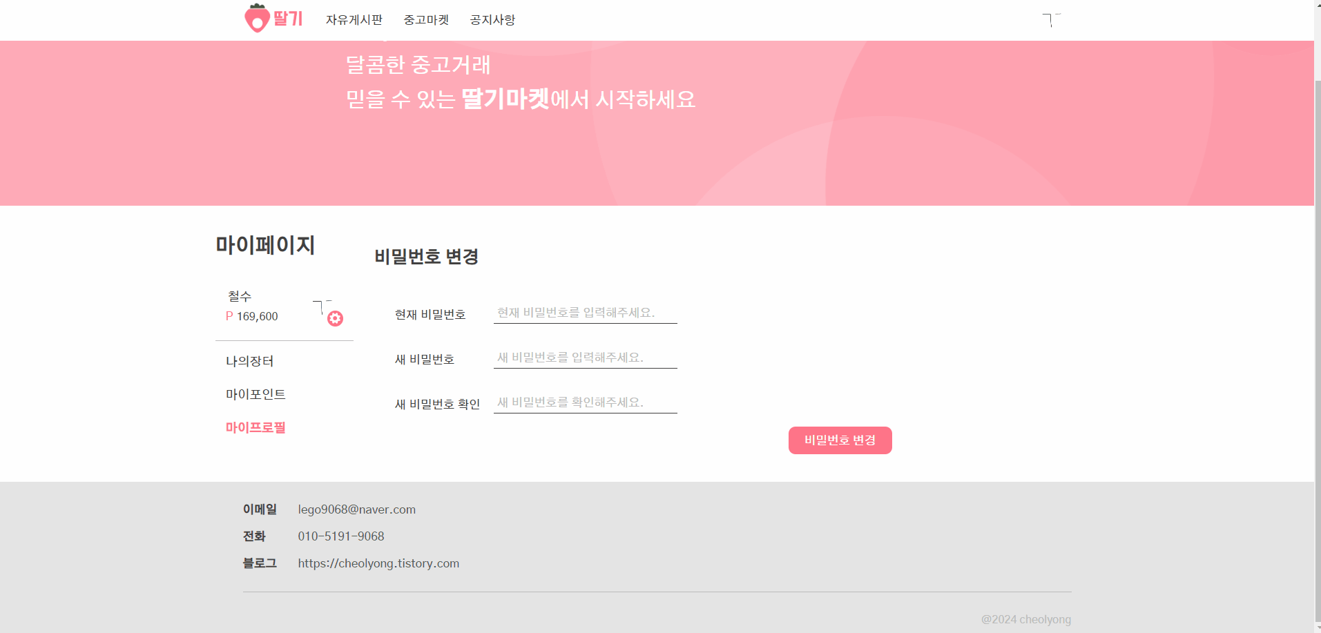 - 비밀번호는 변경하면 로그인 페이지로 이동합니다(로그아웃도 동시에 되도록 추후에 수정).