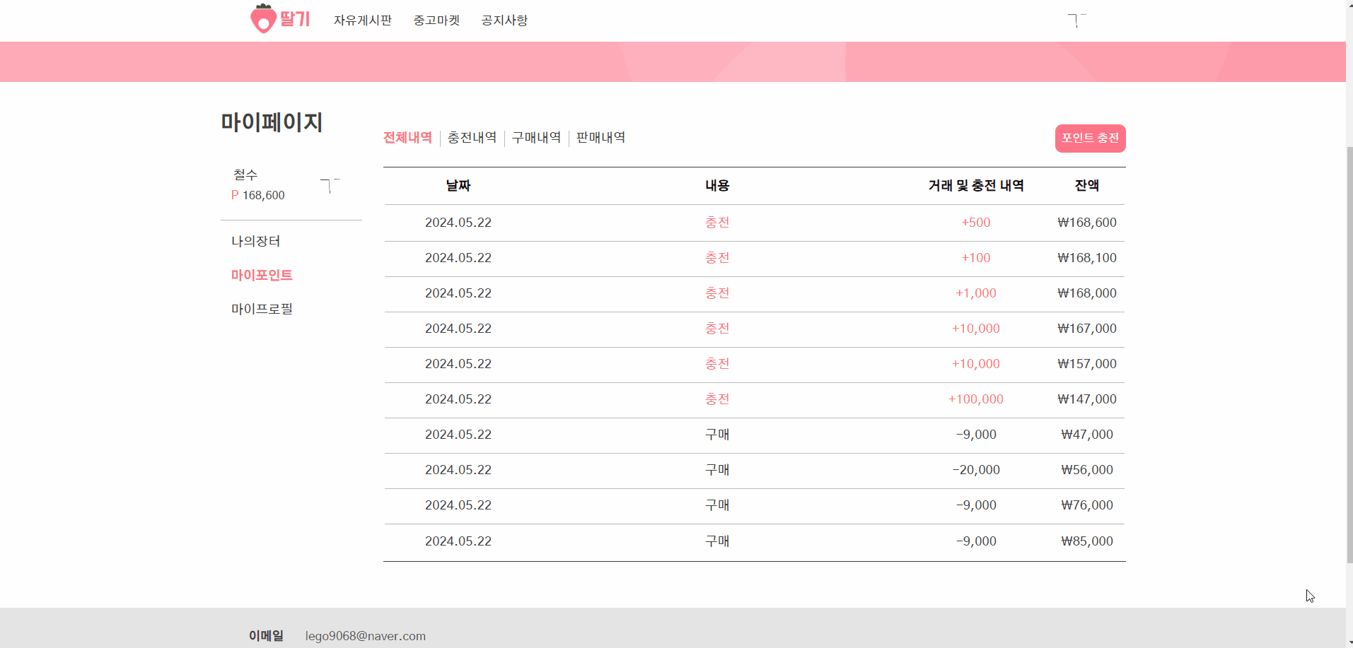 - 포인트가 증가하는 내역(충전, 판매)은 전체내역에서 분홍색으로 표시됩니다.