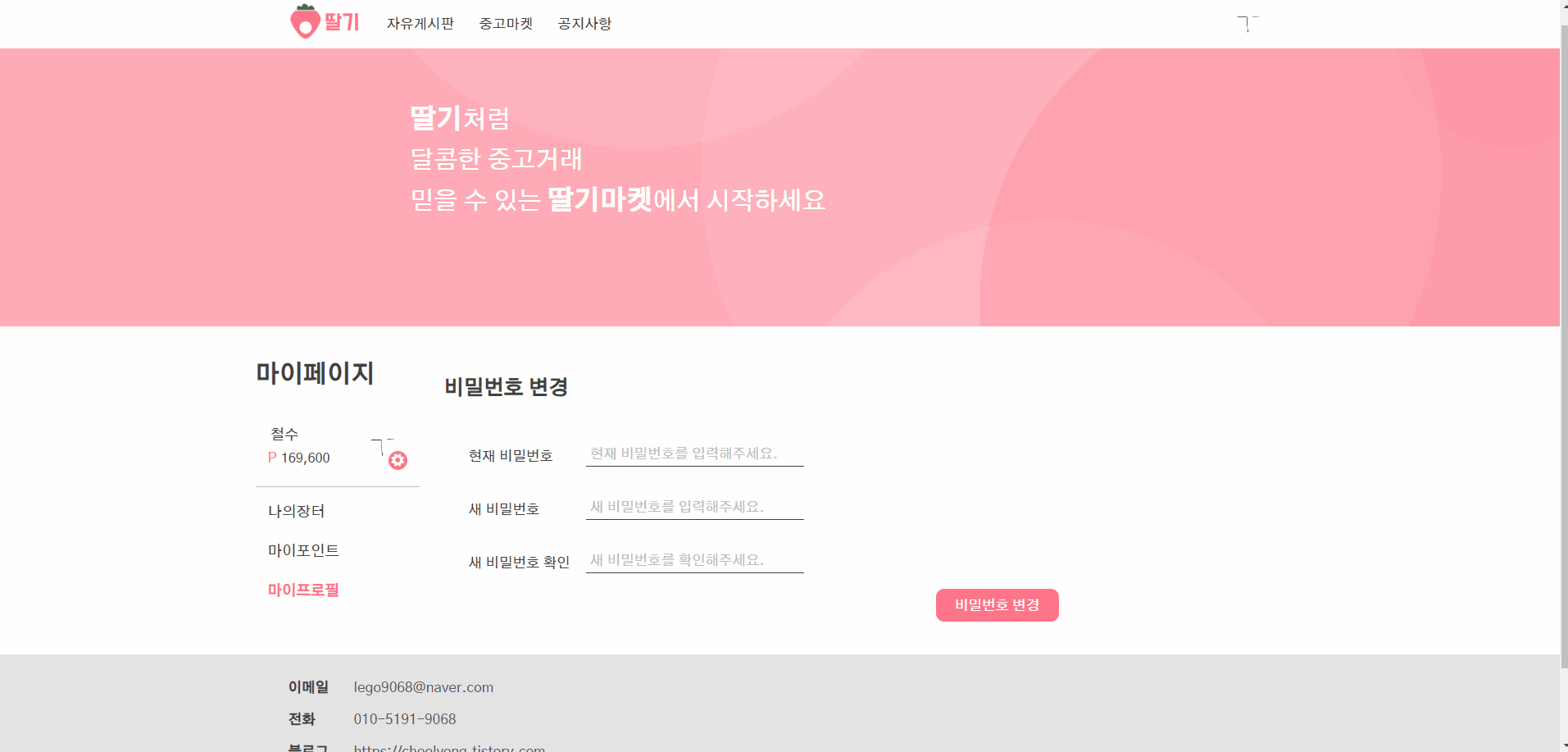 - 비밀번호는 변경하면 로그인 페이지로 이동합니다(로그아웃도 동시에 되도록 추후에 수정).