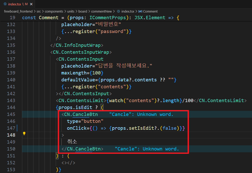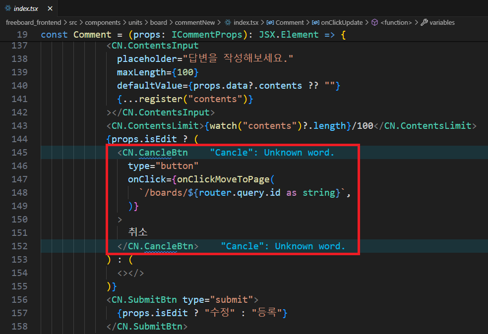 댓글 수정을 취소하려면 단순히 isEdit를 false로 바꾸면 되기 때문에 onClick 함수에 props로 받아온 setIsEdit를 활용해 state값을 false로 만들어 주어 버그를 해결했습니다.