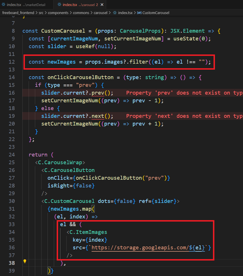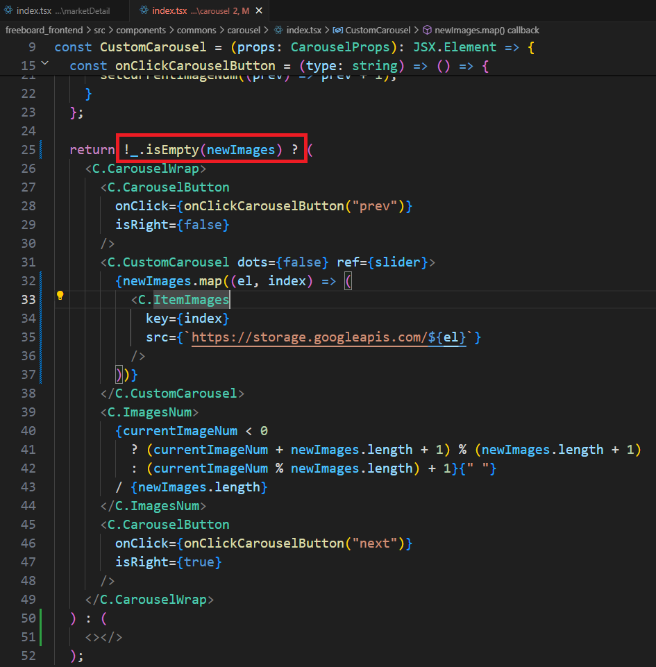 ItemImages 컴포넌트를 조건부 렌더링으로 newImages 배열에 값이 있을 때만 생성하고 있는데, 이 코드는 이미지만 조건부 렌더링할 뿐, 캐러셀은 그대로 렌더링되기 때문에 버그가 발생합니다.